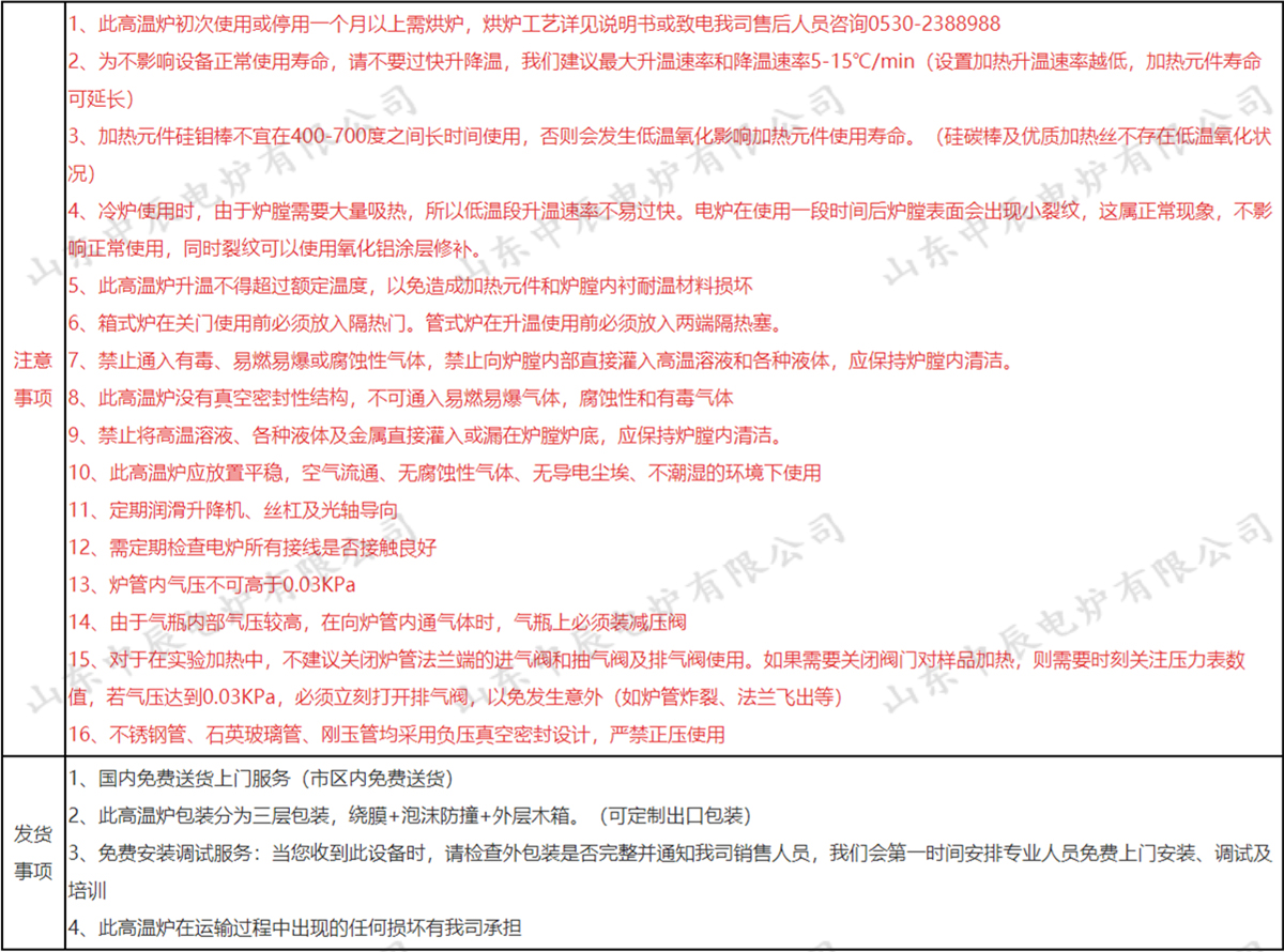 加熱元件兩支,棒具兩套,坩堝鉗一把,高溫手套一副,說明書、合格證各一份,出廠檢測報告一份,送貨單一份,爐門隔熱磚一塊(根據爐型配訂) | |||||
